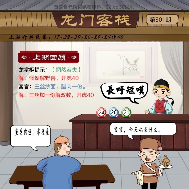 301期:【本草纲目】破解龙门客栈 掌柜:長吁短嘆 解释:形容因忧愁、烦闷而不断发出叹息声的情态 小二:客官,今天吃点什么 解释:无 客官:鱼香肉丝,水煮鱼 解释:鱼香肉丝解肉肖的生肖虎、蛇、龙、狗。水煮鱼解水肖的生肖鼠、猪 特肖:狗龙猪马牛虎羊蛇鸡 |